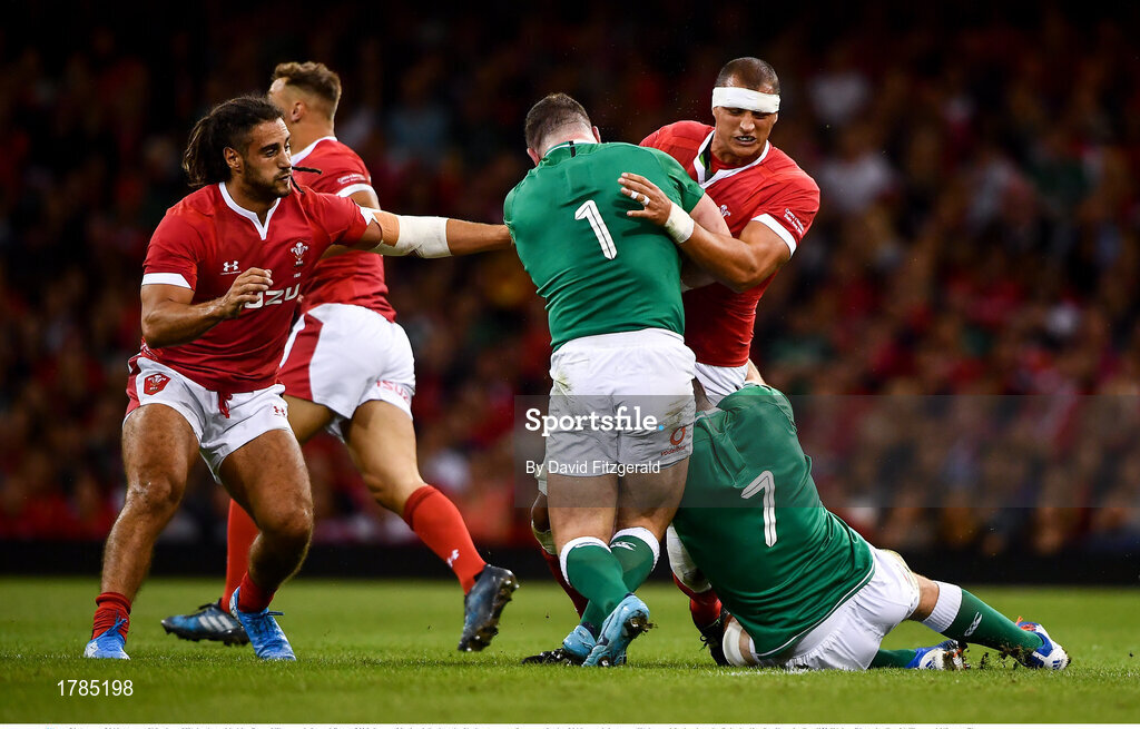31 August 2019; Aaron Shingler of Wales is tackled by Dave Kilcoyne, left, and Peter O’Mahony of Ireland during the Under Armour Summer Series 2019 match between Wales and Ireland at the Principality Stadium in Cardiff, Wales. Photo by David Fitzgerald/Sportsfile