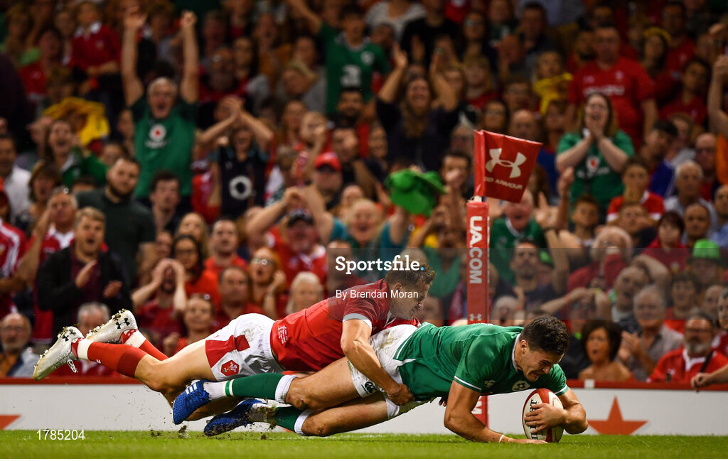 31 August 2019; Jacob Stockdale of Ireland scores his side's second try despite the tackle of Hallam Amos of Wales during the Under Armour Summer Series 2019 match between Wales and Ireland at the Principality Stadium in Cardiff, Wales. Photo by Brendan Moran/Sportsfile