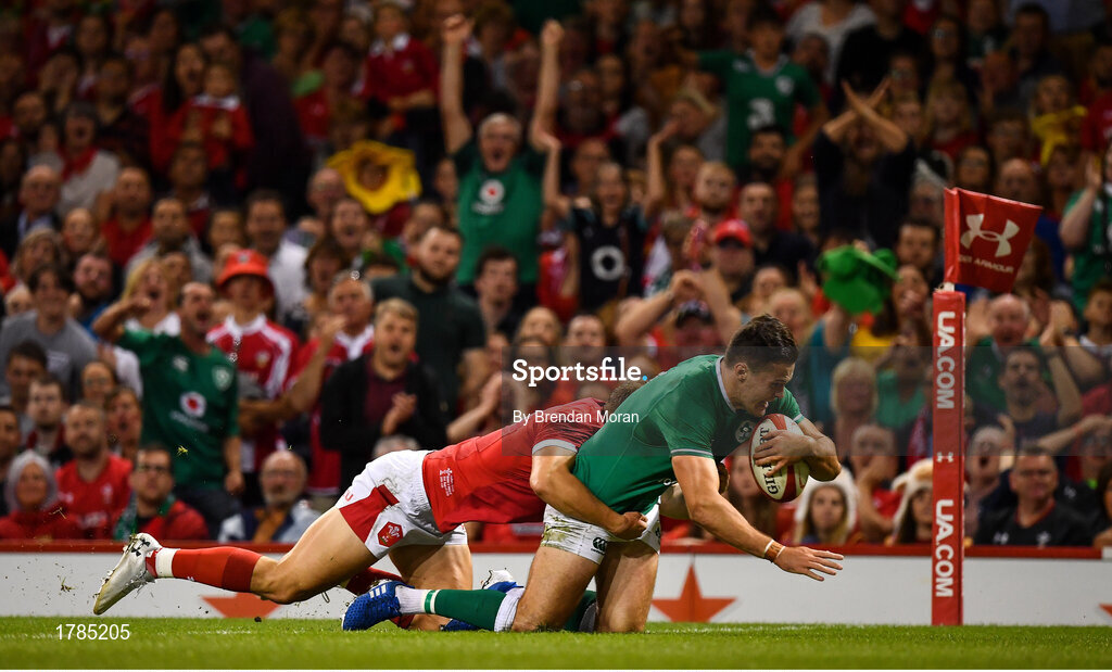 31 August 2019; Jacob Stockdale of Ireland scores his side's second try despite the tackle of Hallam Amos of Wales during the Under Armour Summer Series 2019 match between Wales and Ireland at the Principality Stadium in Cardiff, Wales. Photo by Brendan Moran/Sportsfile