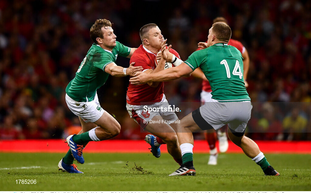 31 August 2019; Steff Evans of Wales is tackled by Jack Carty, left, and Andrew Conway of Ireland during the Under Armour Summer Series 2019 match between Wales and Ireland at the Principality Stadium in Cardiff, Wales. Photo by David Fitzgerald/Sportsfile