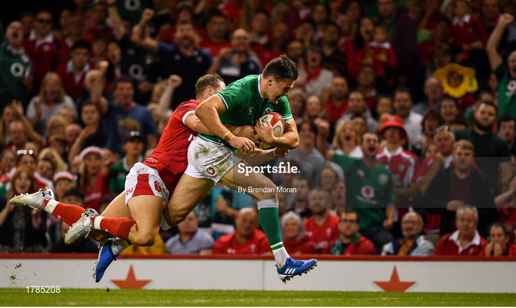 31 August 2019; Jacob Stockdale of Ireland on the way to scoring his side's second try despite the tackle of Hallam Amos of Wales during the Under Armour Summer Series 2019 match between Wales and Ireland at the Principality Stadium in Cardiff, Wales. Photo by Brendan Moran/Sportsfile