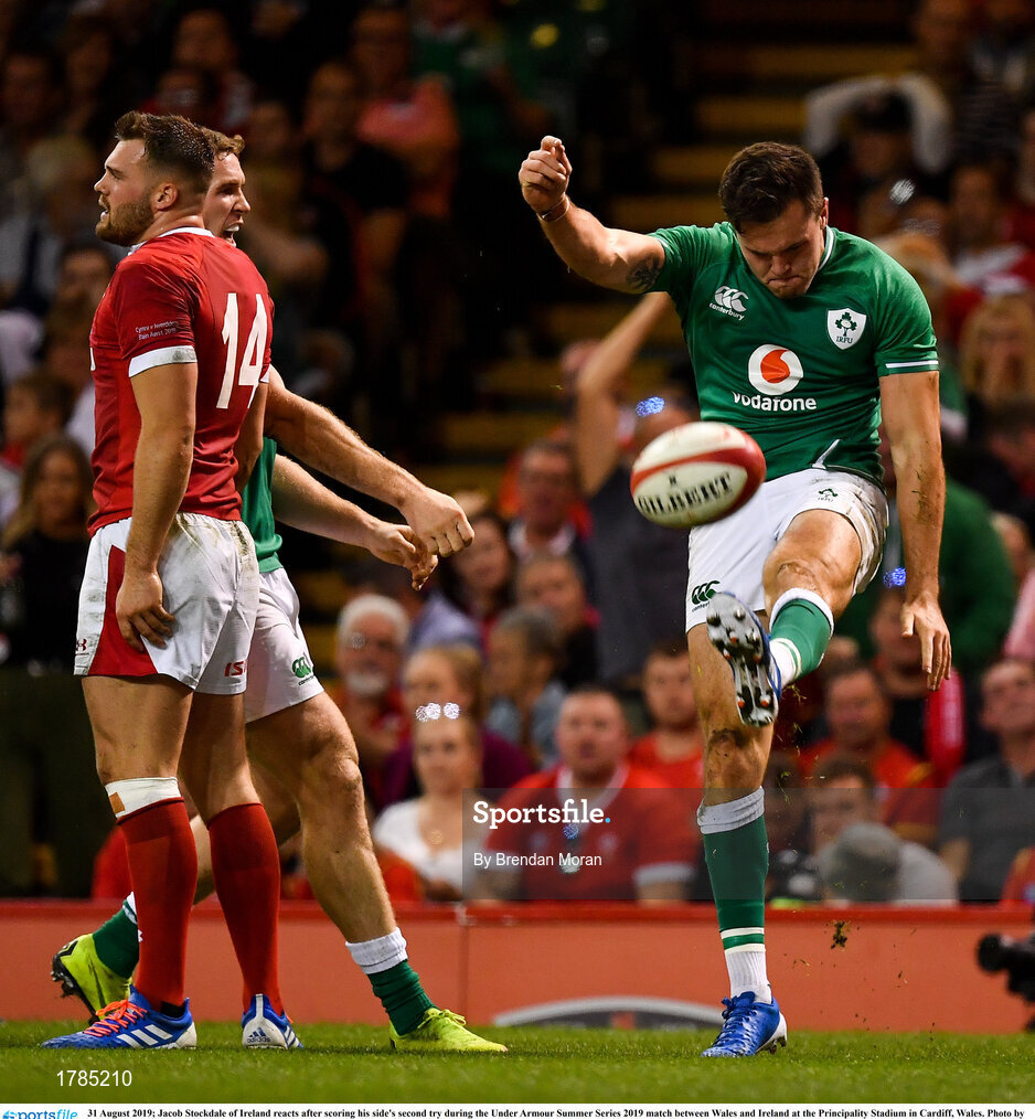 31 August 2019; Jacob Stockdale of Ireland reacts after scoring his side's second try during the Under Armour Summer Series 2019 match between Wales and Ireland at the Principality Stadium in Cardiff, Wales. Photo by Brendan Moran/Sportsfile