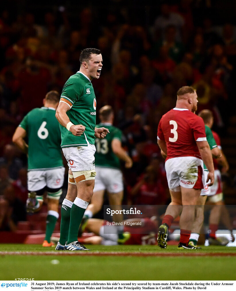 31 August 2019; James Ryan of Ireland celebrates his side's second try scored by team-mate Jacob Stockdale during the Under Armour Summer Series 2019 match between Wales and Ireland at the Principality Stadium in Cardiff, Wales. Photo by David Fitzgerald/Sportsfile