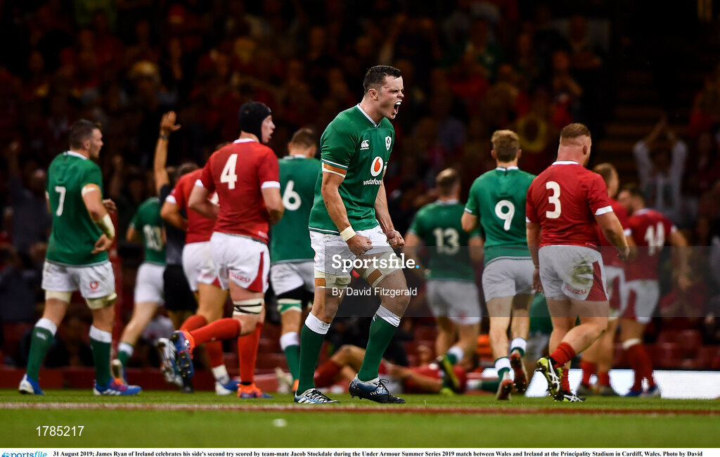 31 August 2019; James Ryan of Ireland celebrates his side's second try scored by team-mate Jacob Stockdale during the Under Armour Summer Series 2019 match between Wales and Ireland at the Principality Stadium in Cardiff, Wales. Photo by David Fitzgerald/Sportsfile