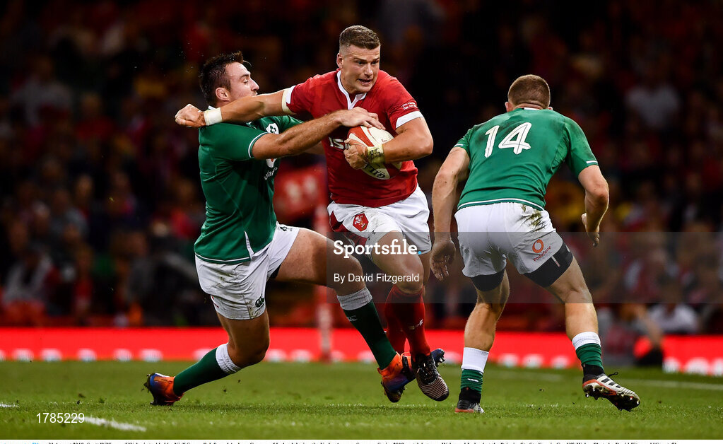 31 August 2019; Scott Williams of Wales is tackled by Niall Scannell, left, and Andrew Conway of Ireland during the Under Armour Summer Series 2019 match between Wales and Ireland at the Principality Stadium in Cardiff, Wales. Photo by David Fitzgerald/Sportsfile