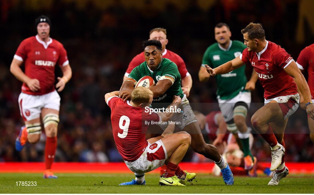 31 August 2019; Bundee Aki of Ireland is tackled by Aled Davies of Wales during the Under Armour Summer Series 2019 match between Wales and Ireland at the Principality Stadium in Cardiff, Wales. Photo by Brendan Moran/Sportsfile