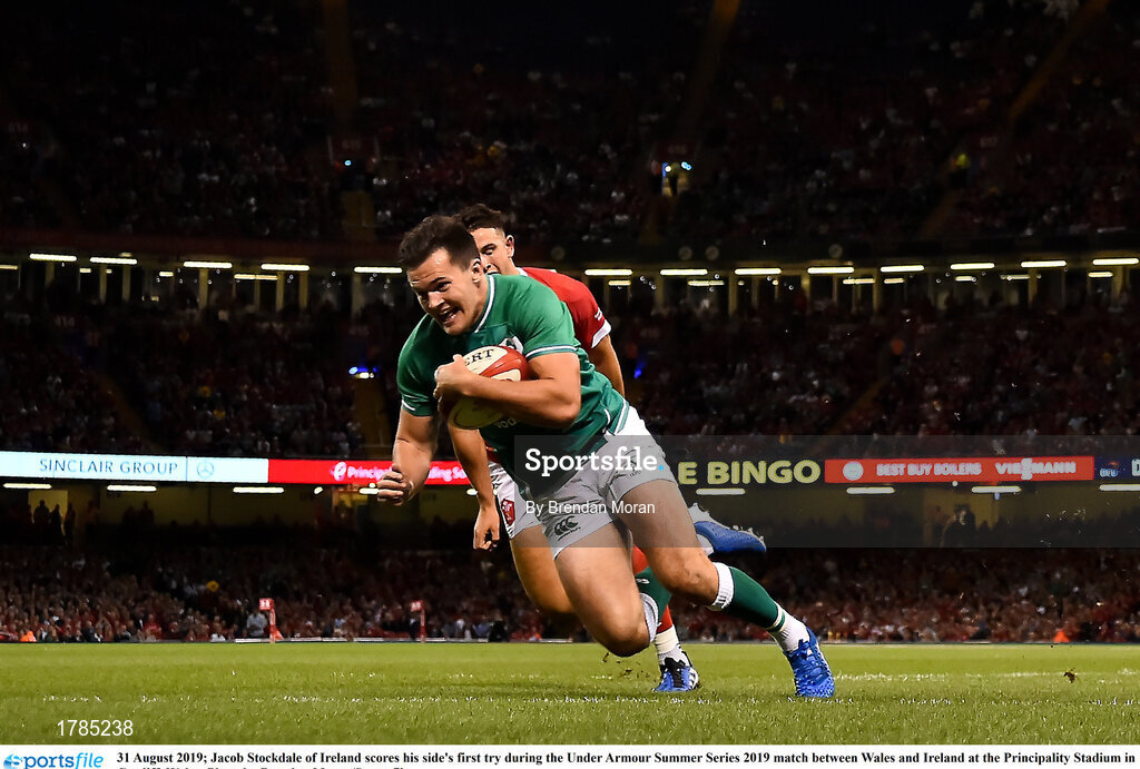 31 August 2019; Jacob Stockdale of Ireland scores his side's first try during the Under Armour Summer Series 2019 match between Wales and Ireland at the Principality Stadium in Cardiff, Wales. Photo by Brendan Moran/Sportsfile