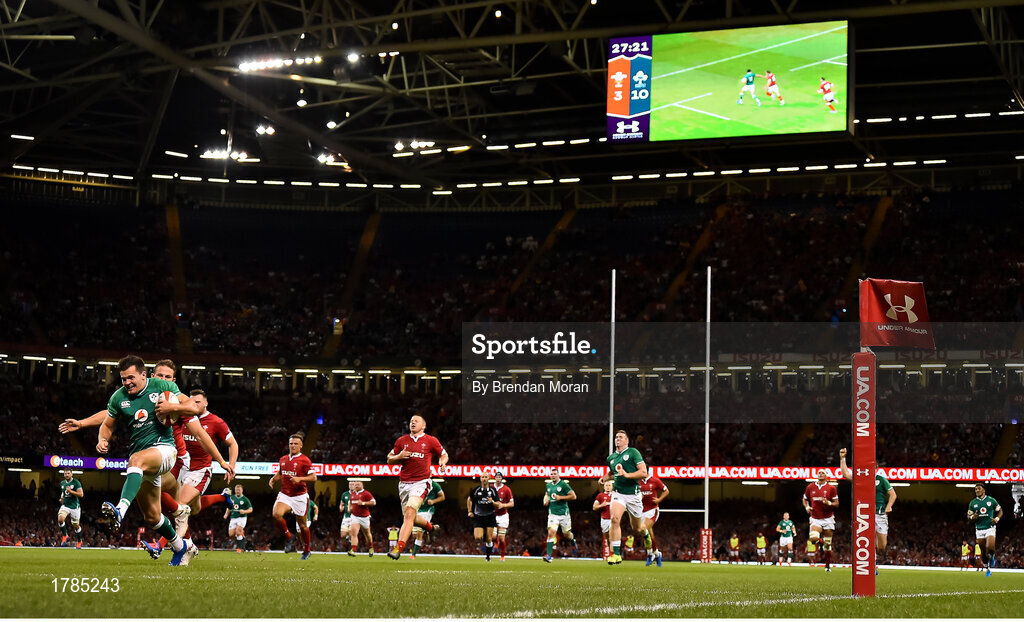 31 August 2019; Jacob Stockdale of Ireland runs in to score his side's second try during the Under Armour Summer Series 2019 match between Wales and Ireland at the Principality Stadium in Cardiff, Wales. Photo by Brendan Moran/Sportsfile