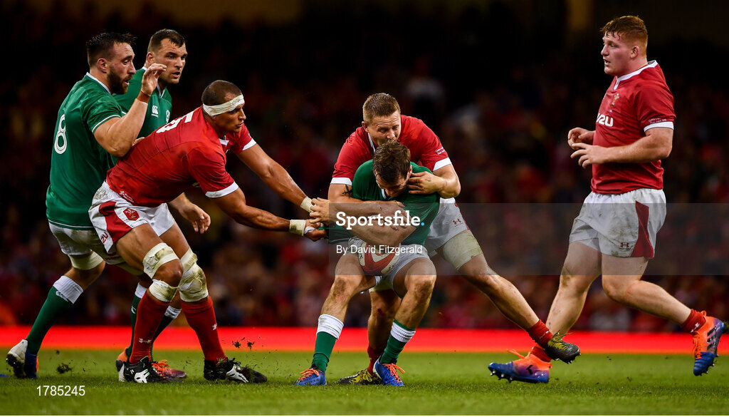 31 August 2019; Jack Carty of Ireland is tackled by Aaron Shingler, left, and James Davies of Wales during the Under Armour Summer Series 2019 match between Wales and Ireland at the Principality Stadium in Cardiff, Wales. Photo by David Fitzgerald/Sportsfile