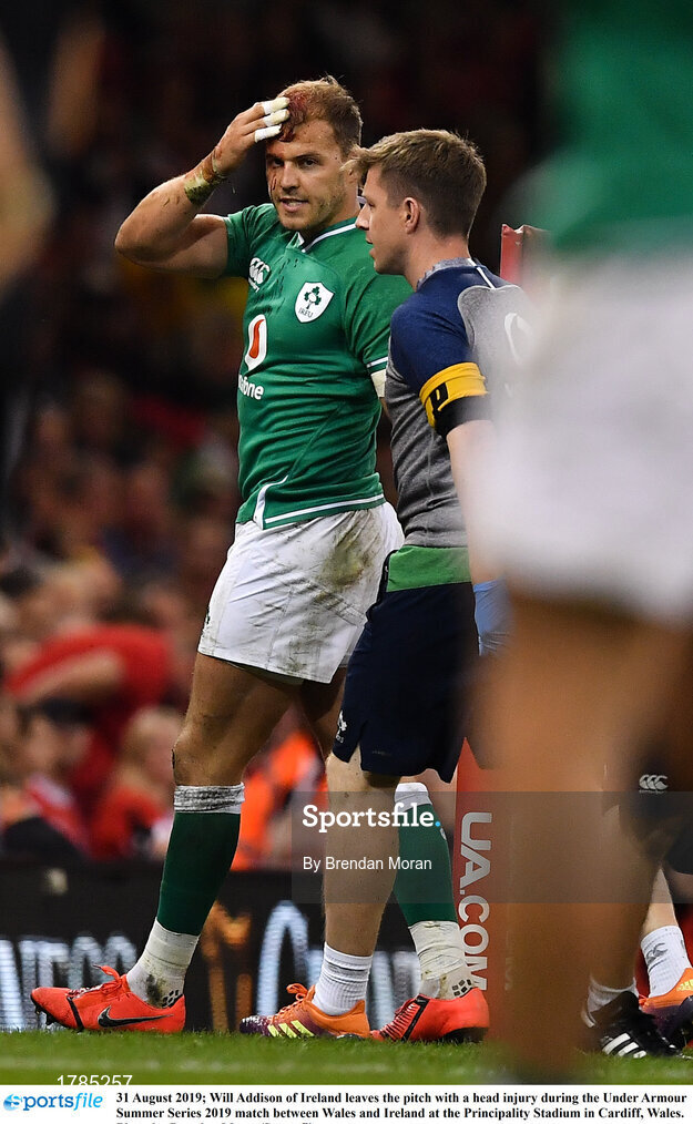 31 August 2019; Will Addison of Ireland leaves the pitch with a head injury during the Under Armour Summer Series 2019 match between Wales and Ireland at the Principality Stadium in Cardiff, Wales. Photo by Brendan Moran/Sportsfile