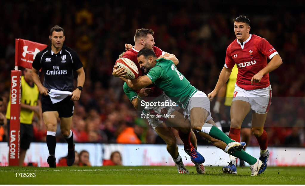 31 August 2019; Owen Lane of Wales is tackled by Dave Kearney and Kieran Marmion of Ireland during the Under Armour Summer Series 2019 match between Wales and Ireland at the Principality Stadium in Cardiff, Wales. Photo by Brendan Moran/Sportsfile