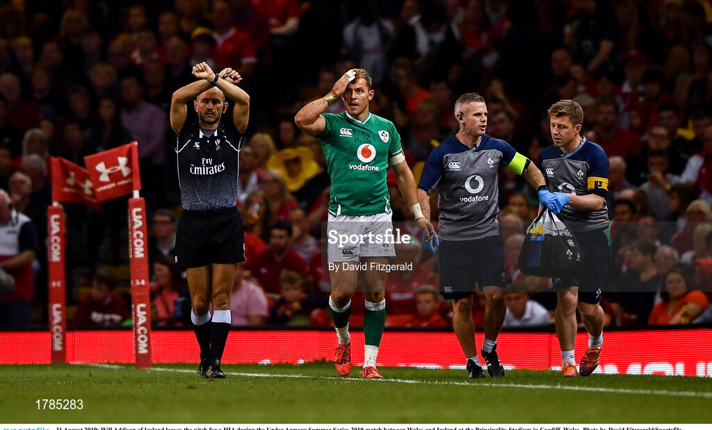 31 August 2019; Will Addison of Ireland leaves the pitch for a HIA during the Under Armour Summer Series 2019 match between Wales and Ireland at the Principality Stadium in Cardiff, Wales. Photo by David Fitzgerald/Sportsfile