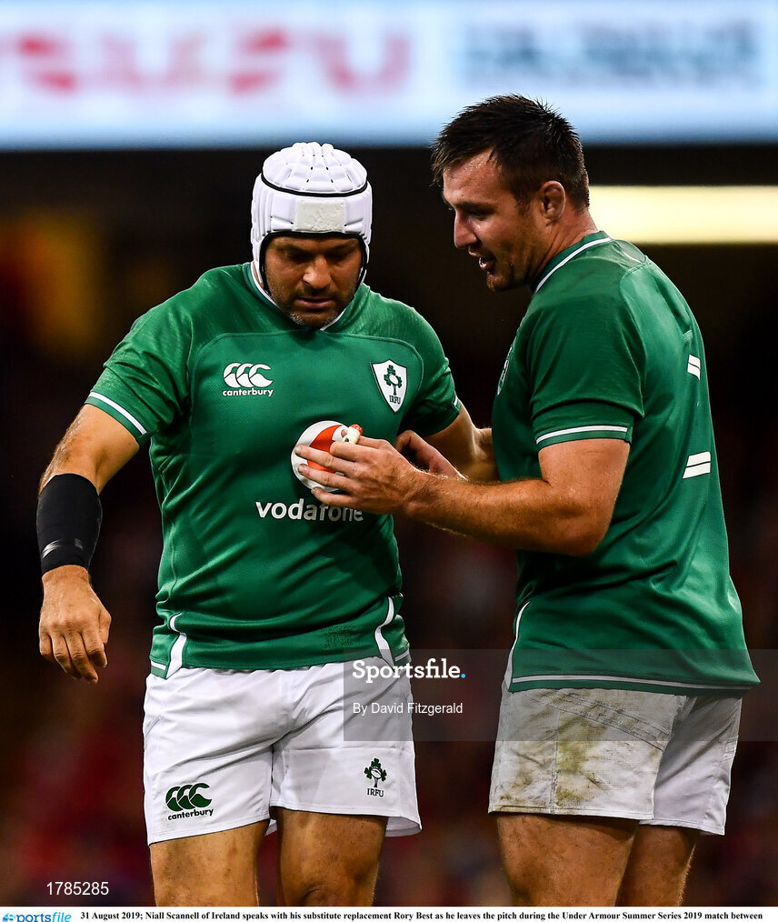 31 August 2019; Niall Scannell of Ireland speaks with his substitute replacement Rory Best as he leaves the pitch during the Under Armour Summer Series 2019 match between Wales and Ireland at the Principality Stadium in Cardiff, Wales. Photo by David Fitzgerald/Sportsfile