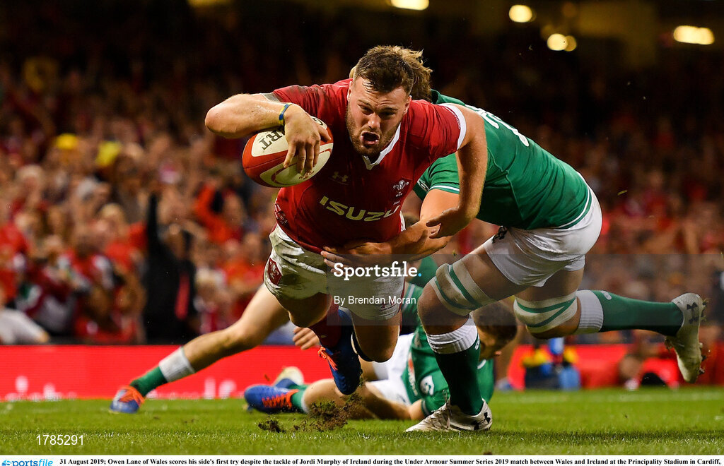 31 August 2019; Owen Lane of Wales scores his side's first try despite the tackle of Jordi Murphy of Ireland during the Under Armour Summer Series 2019 match between Wales and Ireland at the Principality Stadium in Cardiff, Wales. Photo by Brendan Moran/Sportsfile