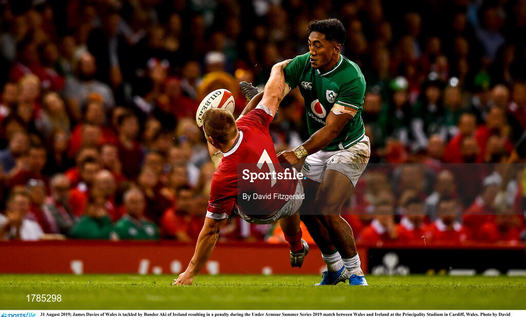 31 August 2019; James Davies of Wales is tackled by Bundee Aki of Ireland resulting in a penalty during the Under Armour Summer Series 2019 match between Wales and Ireland at the Principality Stadium in Cardiff, Wales. Photo by David Fitzgerald/Sportsfile