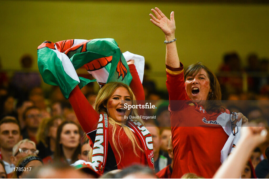 31 August 2019; Wales supporters celebrate a try during the Under Armour Summer Series 2019 match between Wales and Ireland at the Principality Stadium in Cardiff, Wales. Photo by David Fitzgerald/Sportsfile