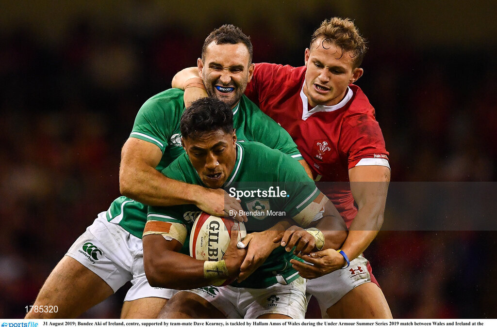 31 August 2019; Bundee Aki of Ireland, centre, supported by team-mate Dave Kearney, is tackled by Hallam Amos of Wales during the Under Armour Summer Series 2019 match between Wales and Ireland at the Principality Stadium in Cardiff, Wales. Photo by Brendan Moran/Sportsfile
