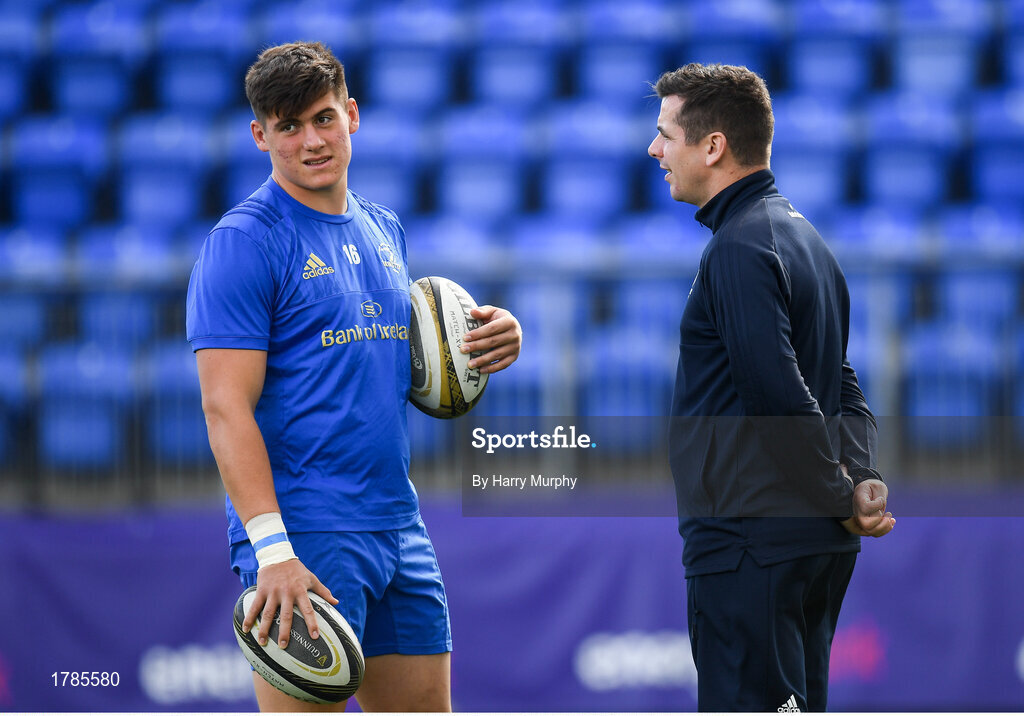 31 August 2019; Dan Sheehan of Leinster speaks with Leinster head coach Noel McNamara during the The Celtic Cup Round 2 match between Leinster A and Scarlets A at Energia Park in Donnybrook, Dublin. Photo by Harry Murphy/Sportsfile