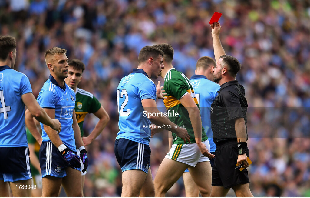1 September 2019; Jonny Cooper of Dublin, second from left, is shown the red card by referee David Gough, after previously been shown a second yellow card, during the GAA Football All-Ireland Senior Championship Final match between Dublin and Kerry at Croke Park in Dublin. Photo by Piaras Ó Mídheach/Sportsfile