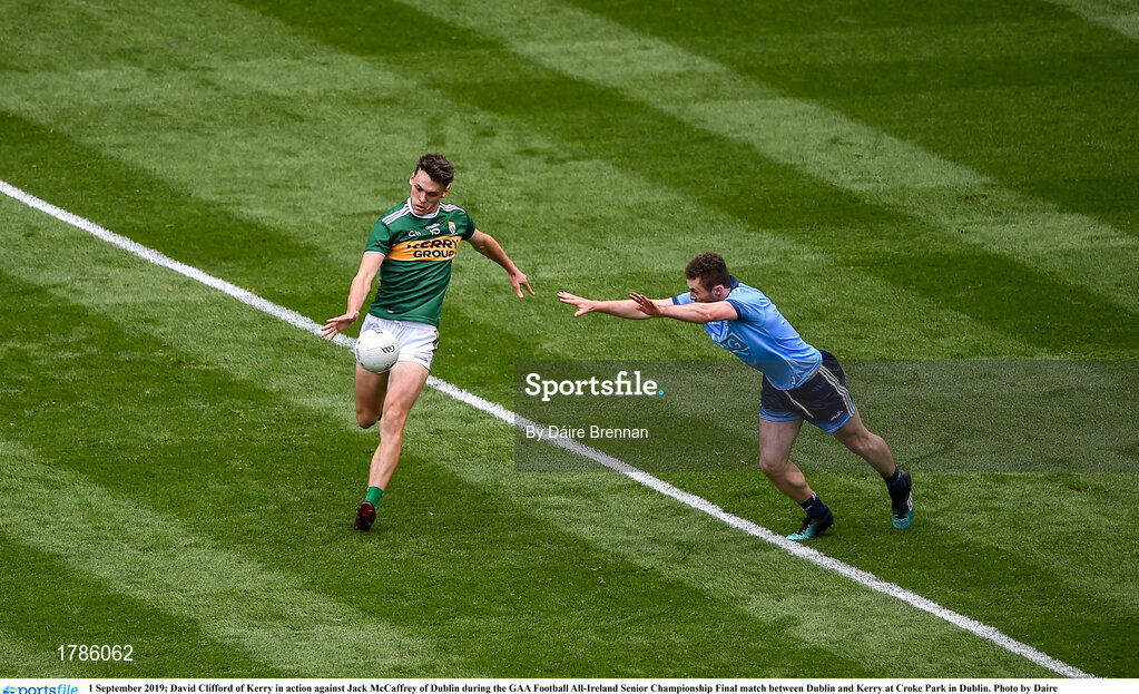 1 September 2019; David Clifford of Kerry in action against Jack McCaffrey of Dublin during the GAA Football All-Ireland Senior Championship Final match between Dublin and Kerry at Croke Park in Dublin. Photo by Daire Brennan/Sportsfile