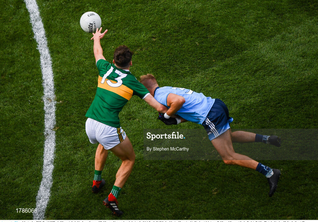 1 September 2019; David Clifford of Kerry is fouled by Jonny Cooper of Dublin, resulting in a red card, during the GAA Football All-Ireland Senior Championship Final match between Dublin and Kerry at Croke Park in Dublin. Photo by Stephen McCarthy/Sportsfile