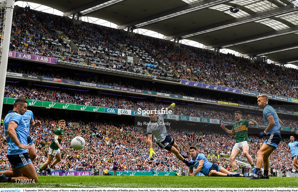 1 September 2019; Paul Geaney of Kerry watches a shot at goal despite the attention of Dublin players, from left, James McCarthy, Stephen Cluxton, David Byrne and Jonny Cooper during the GAA Football All-Ireland Senior Championship Final match between Dublin and Kerry at Croke Park in Dublin. Photo by Ramsey Cardy/Sportsfile