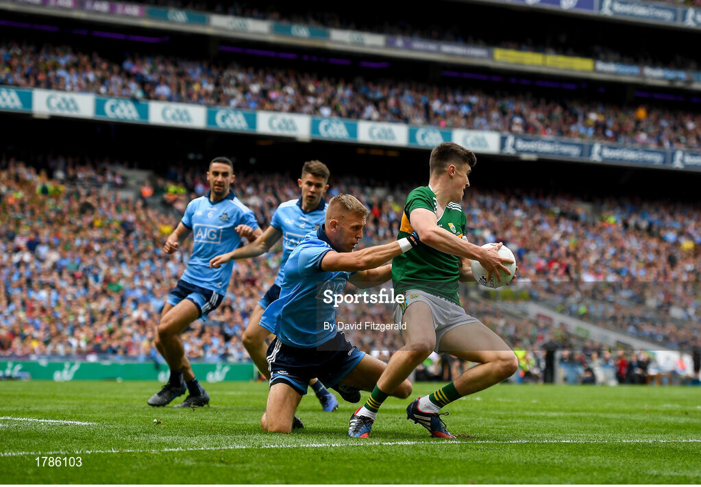 1 September 2019; Seán O'Shea of Kerry is tackled by Jonny Cooper of Dublin during the GAA Football All-Ireland Senior Championship Final match between Dublin and Kerry at Croke Park in Dublin. Photo by David Fitzgerald/Sportsfile