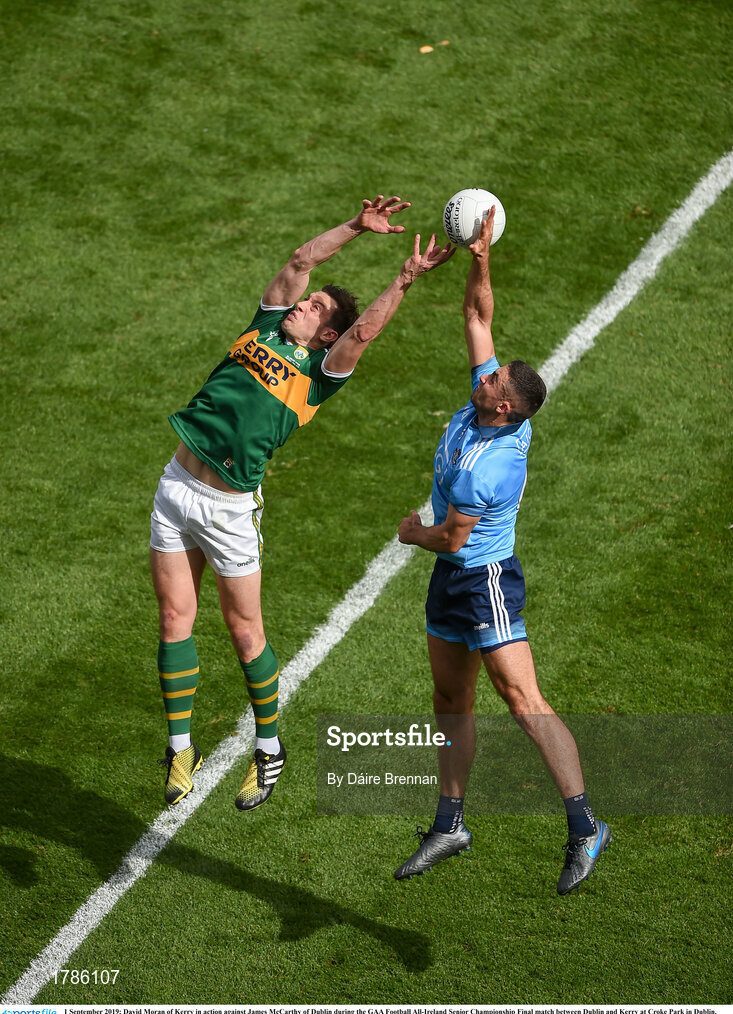 1 September 2019; David Moran of Kerry in action against James McCarthy of Dublin during the GAA Football All-Ireland Senior Championship Final match between Dublin and Kerry at Croke Park in Dublin. Photo by Daire Brennan/Sportsfile