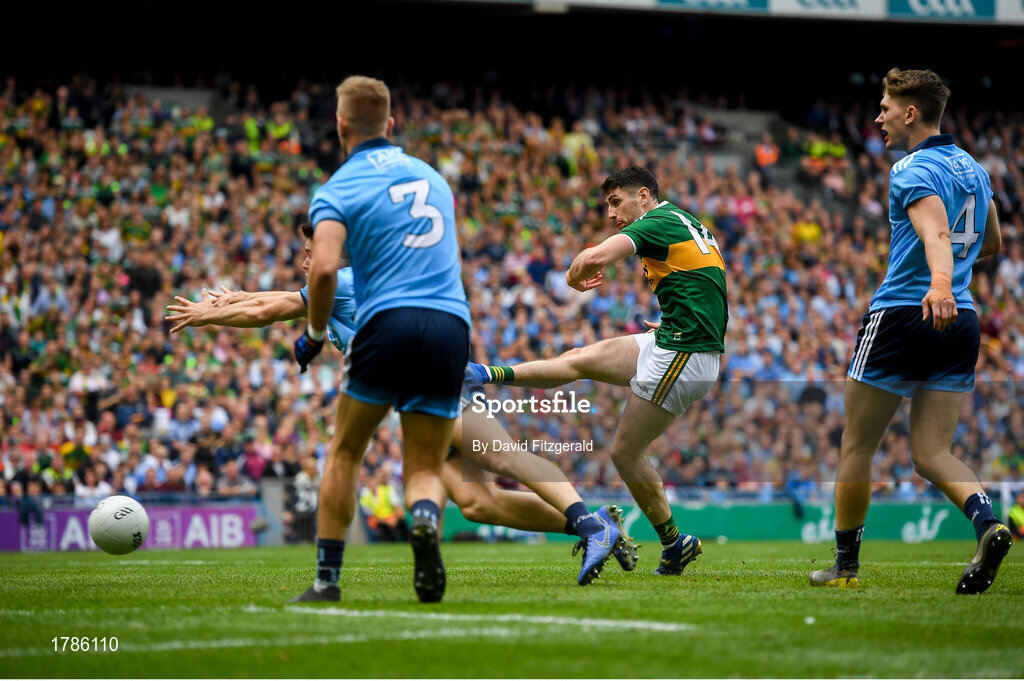 1 September 2019; Paul Geaney of Kerry has a shot on goal during the GAA Football All-Ireland Senior Championship Final match between Dublin and Kerry at Croke Park in Dublin. Photo by David Fitzgerald/Sportsfile