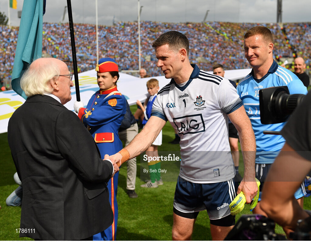 1 September 2019; President Michael D. Higgins shakes hands with Stephen Cluxton of Dublin during the GAA Football All-Ireland Senior Championship Final match between Dublin and Kerry at Croke Park in Dublin. Photo by Seb Daly/Sportsfile