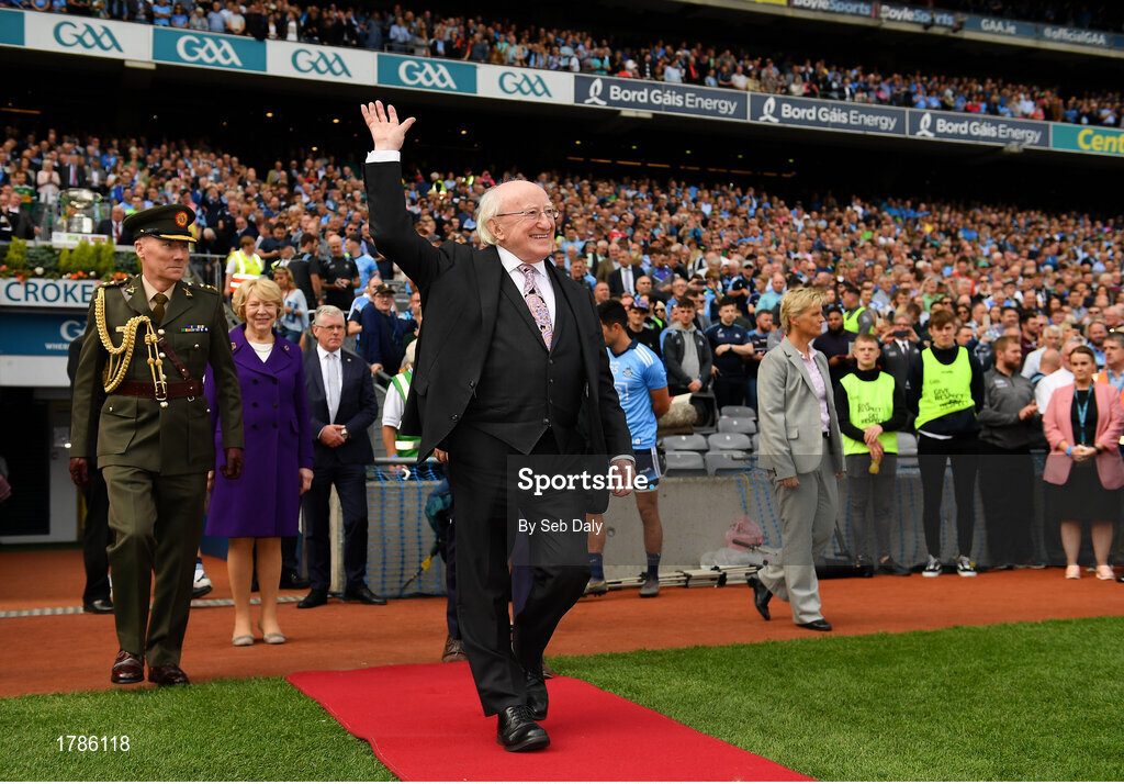 1 September 2019; President Michael D. Higgins acknowledges the crowd before the GAA Football All-Ireland Senior Championship Final match between Dublin and Kerry at Croke Park in Dublin. Photo by Seb Daly/Sportsfile
