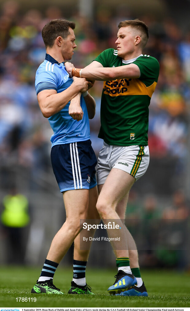 1 September 2019; Dean Rock of Dublin and Jason Foley of Kerry tussle during the GAA Football All-Ireland Senior Championship Final match between Dublin and Kerry at Croke Park in Dublin. Photo by David Fitzgerald/Sportsfile
