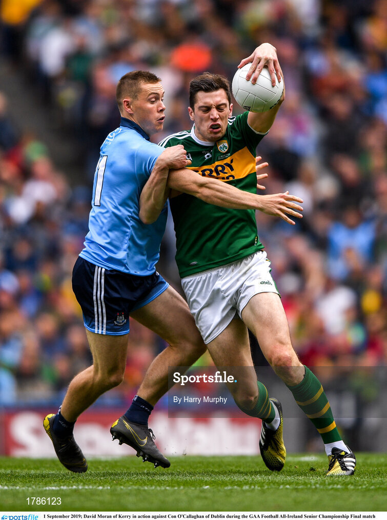 1 September 2019; David Moran of Kerry in action against Con O'Callaghan of Dublin during the GAA Football All-Ireland Senior Championship Final match between Dublin and Kerry at Croke Park in Dublin. Photo by Harry Murphy/Sportsfile