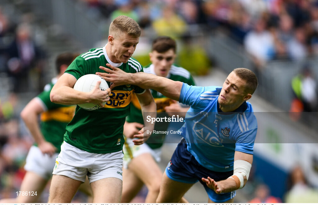 1 September 2019; Gavin Crowley of Kerry in action against Paul Mannion of Dublin during the GAA Football All-Ireland Senior Championship Final match between Dublin and Kerry at Croke Park in Dublin. Photo by Ramsey Cardy/Sportsfile