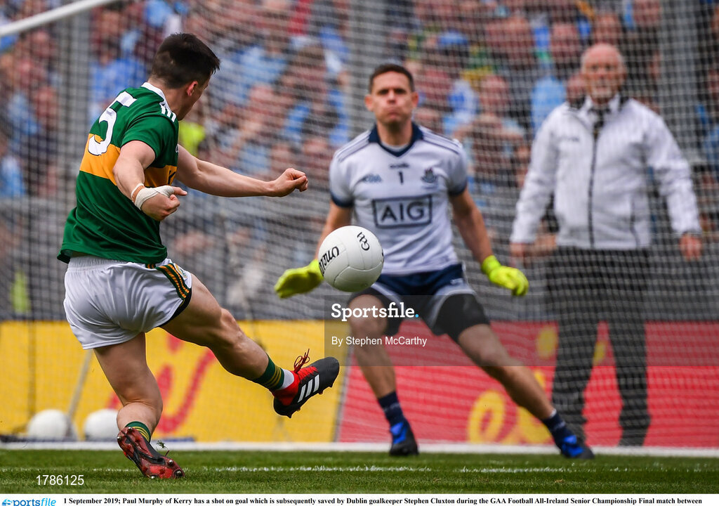 1 September 2019; Paul Murphy of Kerry has a shot on goal which is subsequently saved by Dublin goalkeeper Stephen Cluxton during the GAA Football All-Ireland Senior Championship Final match between Dublin and Kerry at Croke Park in Dublin. Photo by Stephen McCarthy/Sportsfile