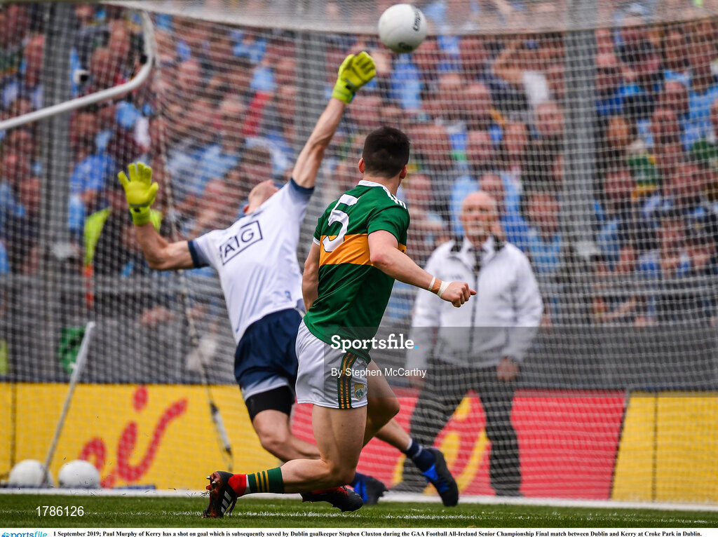 1 September 2019; Paul Murphy of Kerry has a shot on goal which is subsequently saved by Dublin goalkeeper Stephen Cluxton during the GAA Football All-Ireland Senior Championship Final match between Dublin and Kerry at Croke Park in Dublin. Photo by Stephen McCarthy/Sportsfile