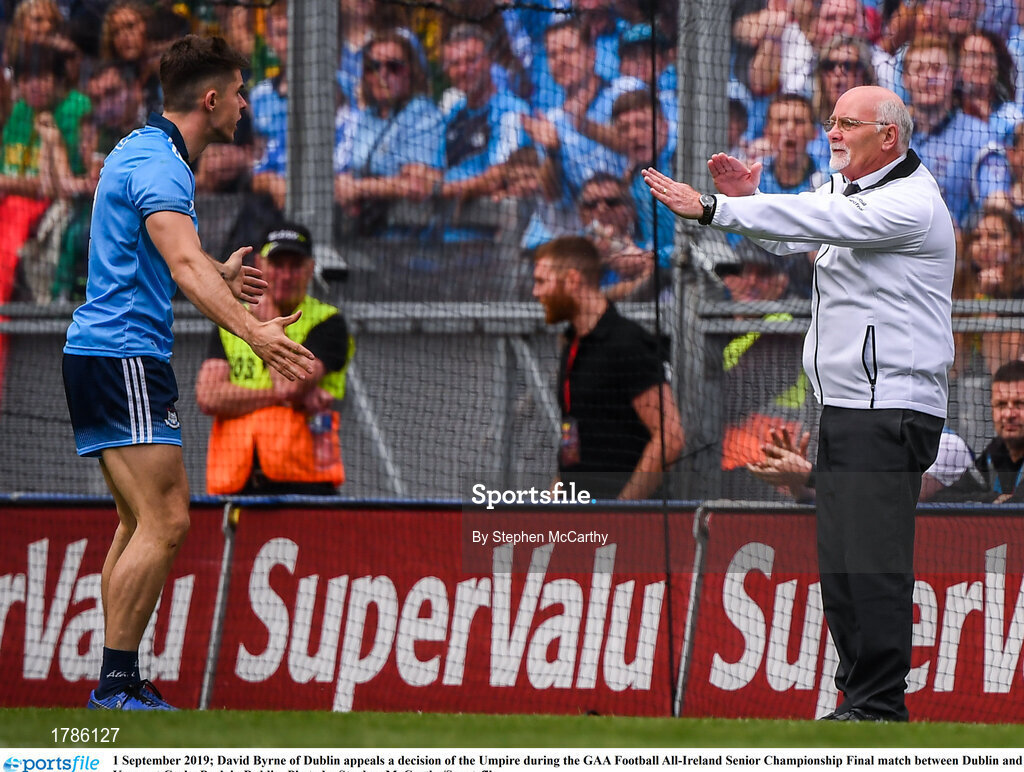 1 September 2019; David Byrne of Dublin appeals a decision of the Umpire during the GAA Football All-Ireland Senior Championship Final match between Dublin and Kerry at Croke Park in Dublin. Photo by Stephen McCarthy/Sportsfile