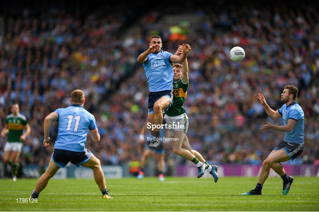 1 September 2019; James McCarthy of Dublin in action against Seán O'Shea of Kerry during the GAA Football All-Ireland Senior Championship Final match between Dublin and Kerry at Croke Park in Dublin. Photo by Eóin Noonan/Sportsfile