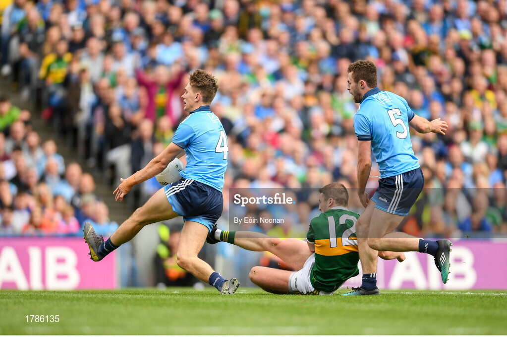 1 September 2019; Stephen O'Brien of Kerry has a shot on goal blocked by Tom O'Sullivan of Kerry during the GAA Football All-Ireland Senior Championship Final match between Dublin and Kerry at Croke Park in Dublin. Photo by Eóin Noonan/Sportsfile