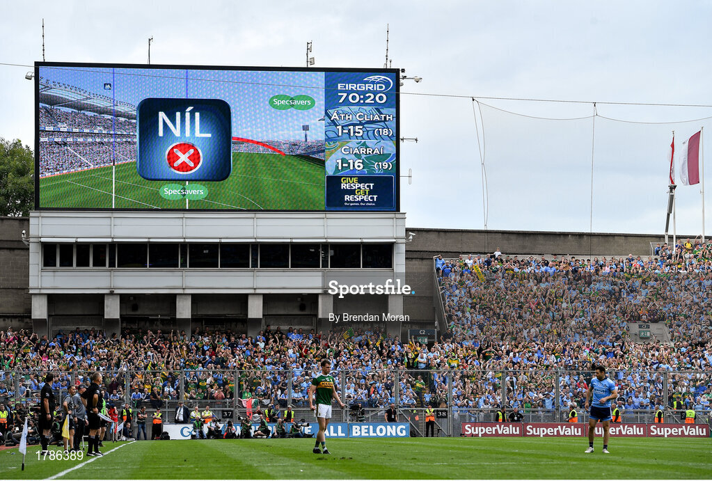 1 September 2019; Hawkeye gives the verdict on a late chance by Cormac Costello of Dublin during the GAA Football All-Ireland Senior Championship Final match between Dublin and Kerry at Croke Park in Dublin. Photo by Brendan Moran/Sportsfile