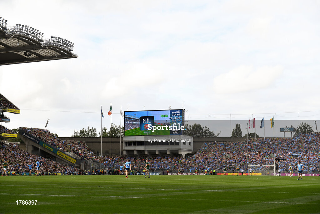 1 September 2019; A general view of the result of Hawkeye on the big screen, showing that an attempt for a point by Cormac Costello in the 70th minute was wide, during the GAA Football All-Ireland Senior Championship Final match between Dublin and Kerry at Croke Park in Dublin. Photo by Piaras Ó Mídheach/Sportsfile
