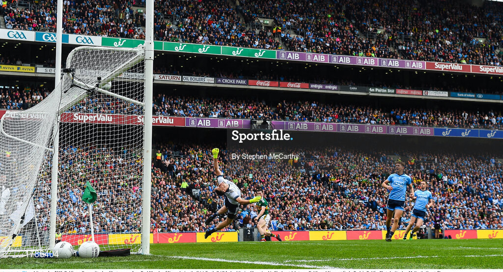1 September 2019; Dublin goalkeeper Stephen Cluxton saves from Paul Murphy of Kerry during the GAA Football All-Ireland Senior Championship Final match between Dublin and Kerry at Croke Park in Dublin. Photo by Stephen McCarthy/Sportsfile