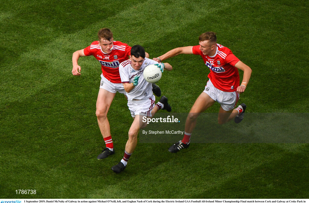 1 September 2019; Daniel McNulty of Galway in action against Michael O'Neill, left, and Eoghan Nash of Cork during the Electric Ireland GAA Football All-Ireland Minor Championship Final match between Cork and Galway at Croke Park in Dublin. Photo by Stephen McCarthy/Sportsfile