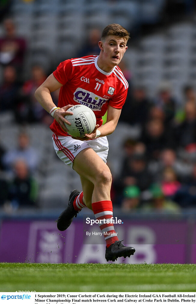 1 September 2019; Conor Corbett of Cork during the Electric Ireland GAA Football All-Ireland Minor Championship Final match between Cork and Galway at Croke Park in Dublin. Photo by Harry Murphy/Sportsfile