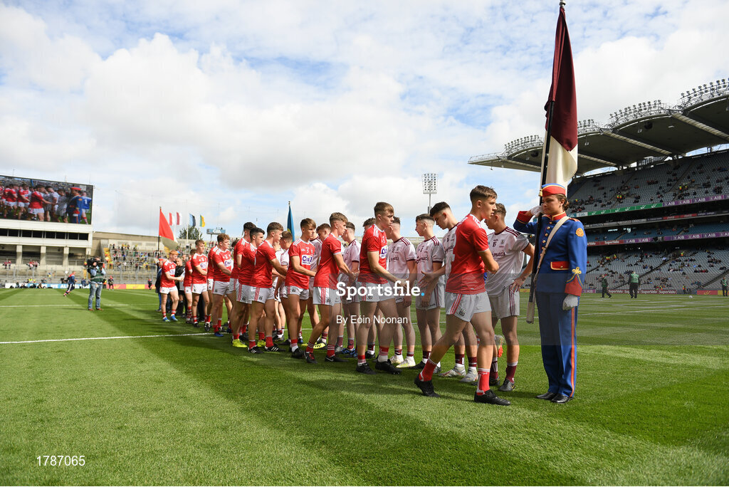 1 September 2019; Respect hand shake prior to the Electric Ireland GAA Football All-Ireland Minor Championship Final match between Cork and Galway at Croke Park in Dublin. Photo by Eóin Noonan/Sportsfile