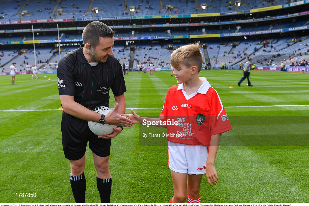 1 September 2019; Referee Noel Mooney is presented with the match ball by Gearóid Linehan, Ballyhass NS, Castlemagner, Co, Cork, before the Electric Ireland GAA Football All-Ireland Minor Championship Final match between Cork and Galway at Croke Park in Dublin. Photo by Piaras Ó Mídheach/Sportsfile