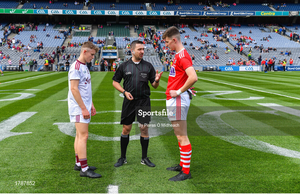 1 September 2019; Referee Noel Mooney with team captains Jonathan McGrath of Galway and Conor Corbett of Cork before the Electric Ireland GAA Football All-Ireland Minor Championship Final match between Cork and Galway at Croke Park in Dublin. Photo by Piaras Ó Mídheach/Sportsfile