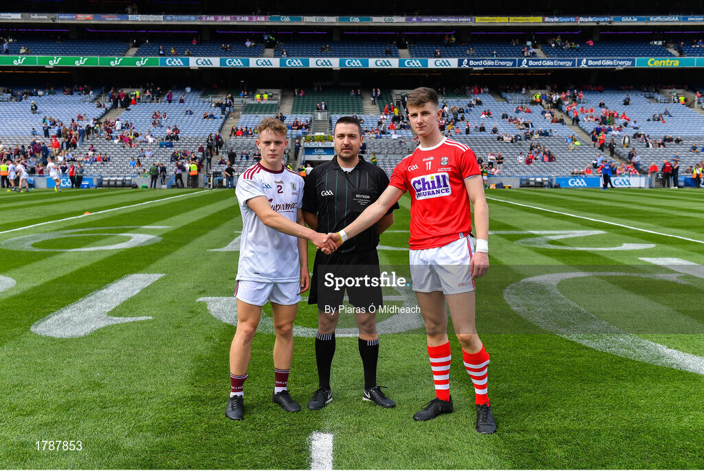 1 September 2019; Referee Noel Mooney with team captains Jonathan McGrath of Galway and Conor Corbett of Cork before the Electric Ireland GAA Football All-Ireland Minor Championship Final match between Cork and Galway at Croke Park in Dublin. Photo by Piaras Ó Mídheach/Sportsfile