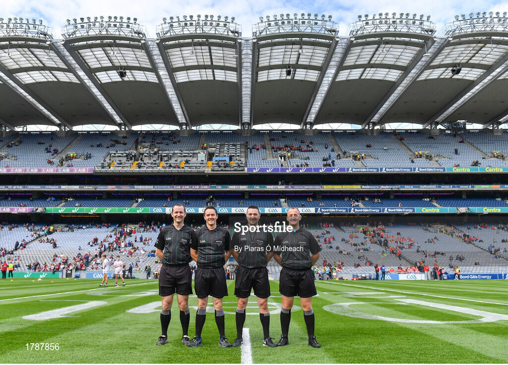 1 September 2019; Match officials, from left, sideline official Jerome Henry, linesman Paddy Neilan, referee Noel Mooney, and linesman Brendan Cawley before the Electric Ireland GAA Football All-Ireland Minor Championship Final match between Cork and Galway at Croke Park in Dublin. Photo by Piaras Ó Mídheach/Sportsfile