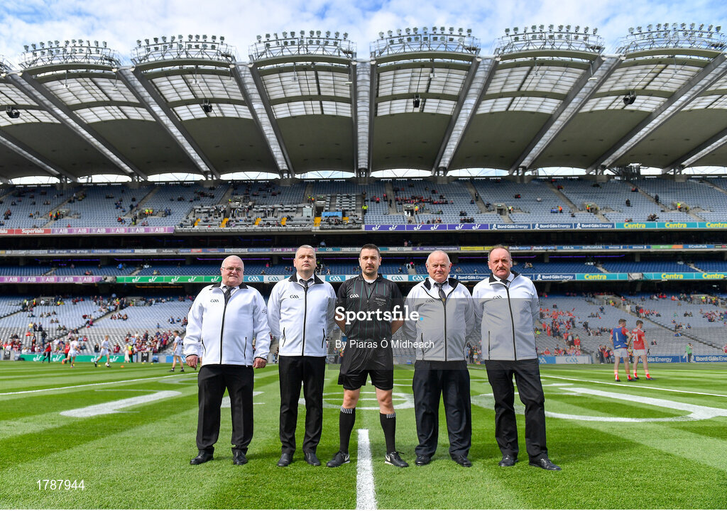 1 September 2019; Referee Noel Mooney with his umpires before the Electric Ireland GAA Football All-Ireland Minor Championship Final match between Cork and Galway at Croke Park in Dublin. Photo by Piaras Ó Mídheach/Sportsfile